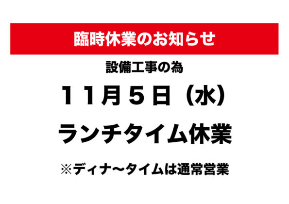 お知らせ 11月5日(水)ランチタイム臨時休業 2025.10.28 11月5日(水)のランチ営業は設備工事の為、休業いたします。 ディナータイムは、通常通り営業いたします。 ご迷惑をおかけいたしますが、ご理解のほどお願いいたします。 Tweet Share Hatena Pocket この記事のタイトルとURLをコピーする 年越し中華オードブルご予約受付開始 前の記事 11月営業日程 (ランチ臨時休業あり) 次の記事